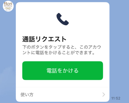 ご予約日程になりましたら、当館より「通話リクエスト」をお送りします。あらかじめ、LINEを立ち上げてご準備をお願いいたします。「電話をかける」ボタンをタップすると当館に発信され、まず音声通話がつながります。
