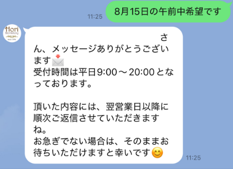 営業時間外のご連絡の場合は以下のメッセージが届きます。営業時間内になりましたらご連絡いたします。