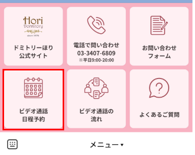 当館公式アカウントとのトーク画面の下にあるメニューから、「ビデオ通話日程予約」をタップします。
