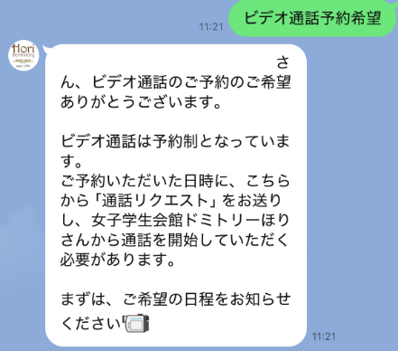 自動的に「ビデオ通話予約希望」というメッセージが送信され、自動応答メッセージが送られます。